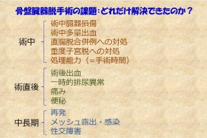 骨盤臓器脱手術におけるピットフォール(↑ここでは「課題」と書いてますが)は、こんな感じ。